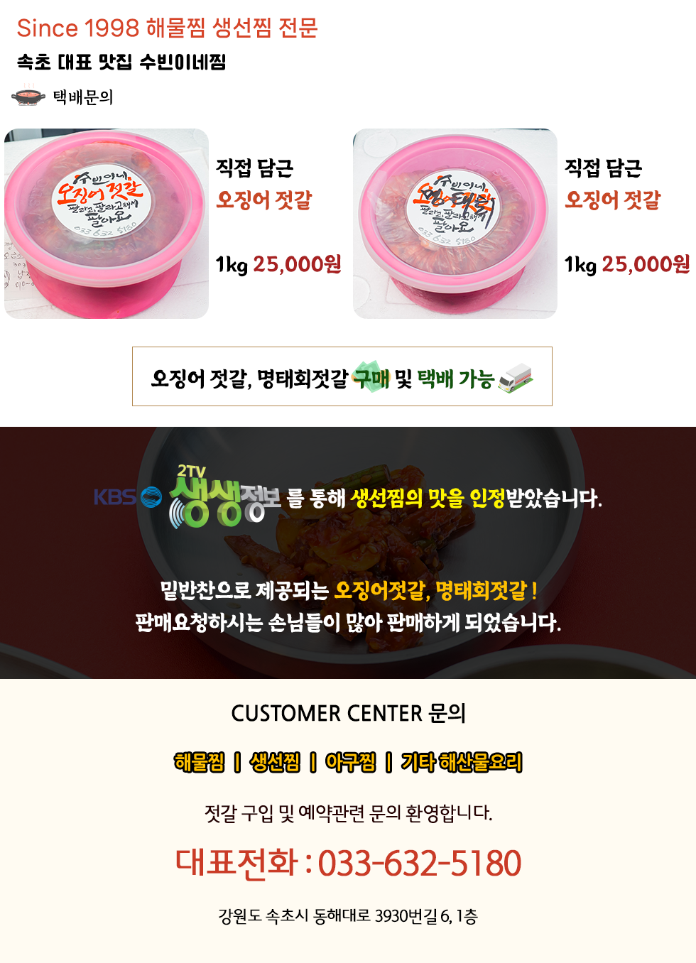 • 수빈이네찜 | 대표 : 조수빈 | 사업자등록번호 : 227-04-74177 | 연락처 : 033-632-5180 | 소재지 : 강원도 속초시 동해대로 3930번길 6 1층